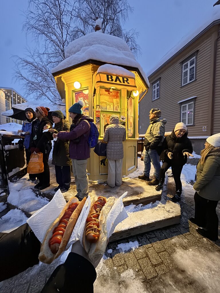 Was bei einem Besuch in Tromsø nicht fehlen darf, ist ein Hotdog der berühmten Raketten Bar. Der Stand, der tatsächlich an eine kleine Rakete erinnert, ist bekannt als Norwegens kleinste Bar und serviert Rentier-Hotdogs aus einem winzigen Fenster heraus. Natürlich stehen auch wir eine Stunde dafür an. Ein kulinarisches Highlight ist es zwar nicht unbedingt, aber anscheinend gehört es einfach dazu. Fun Fact: Unser Kellner war sogar Schweizer.