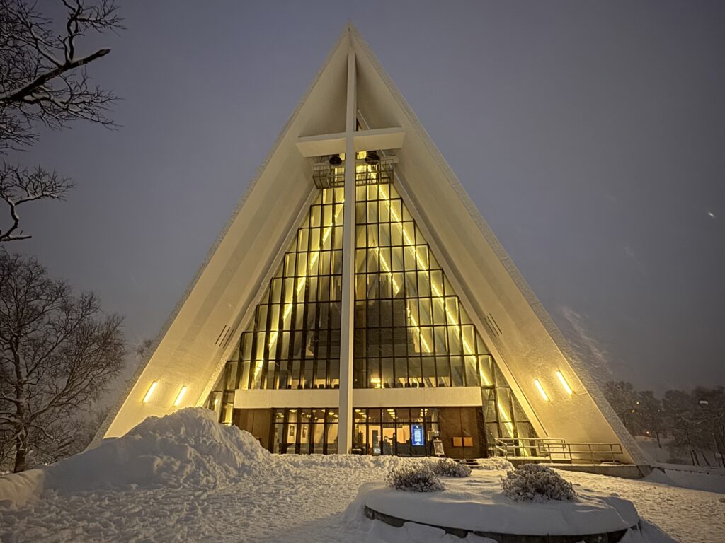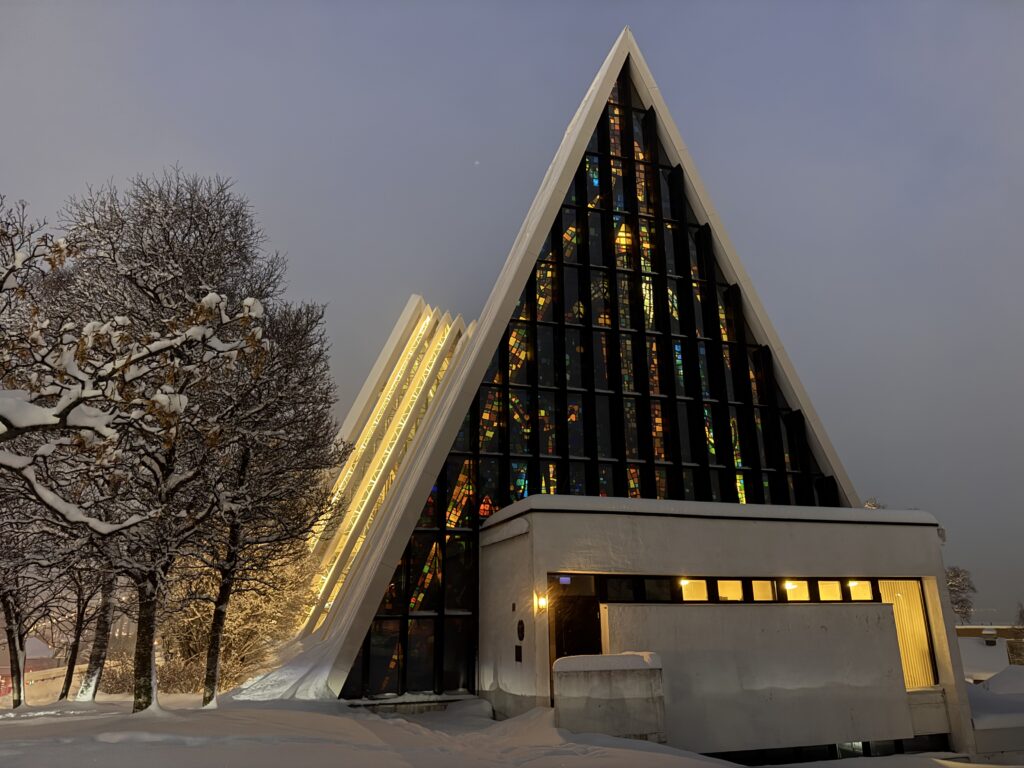 Sobald es eindunkelt, lohnt sich ein Spaziergang über die Tromsøbrua, die ikonische Brücke, hinüber zur Arctic Cathedral, deren Fenster im Schnee warm leuchten. Die Eismeerkathedrale aus dem Jahr 1965 ist ein wahrer Besuchermagnet und schon von weitem aus der Stadt zu sehen. Nicht weit davon entfernt liegt die Fjellheisen, die Seilbahn auf den Berg Storsteinen. Von oben hätte man einen fantastischen Blick über Tromsø und die umliegenden Fjorde – wäre da nur nicht dieser hartnäckige Nebel. Dreimal versuchen wir, ein kurzes Wolkenloch zu erwischen. Doch jedes Mal, wenn wir bei der Seilbahn ankommen, zieht der Nebel wieder zu. Für umgerechnet 47 Franken hinaufzufahren, um anschliessend nichts zu sehen, lohnt sich dann leider wirklich nicht.