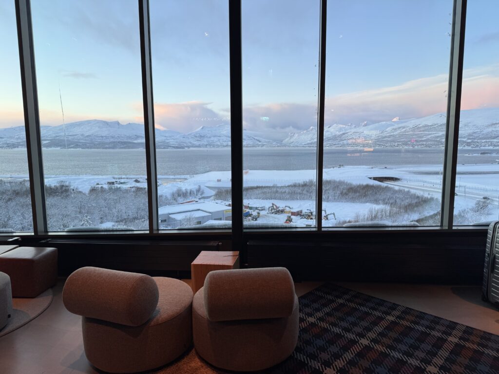 Auch wenn die Insel Tromsø recht klein wirkt, braucht es trotzdem einen Bus, um bequem von einer Seite zur anderen zu gelangen. Unser Moxy-Hotel, direkt beim Flughafen gelegen, bietet eine fantastische Aussicht auf die umliegenden Fjorde. Der Bus ins Stadtzentrum fährt zuverlässig und in kurzen Abständen. Mit einer Wochenkarte für 25 CHF kann man nach Belieben ein- und aussteigen – ideal, um die Insel flexibel zu erkunden.