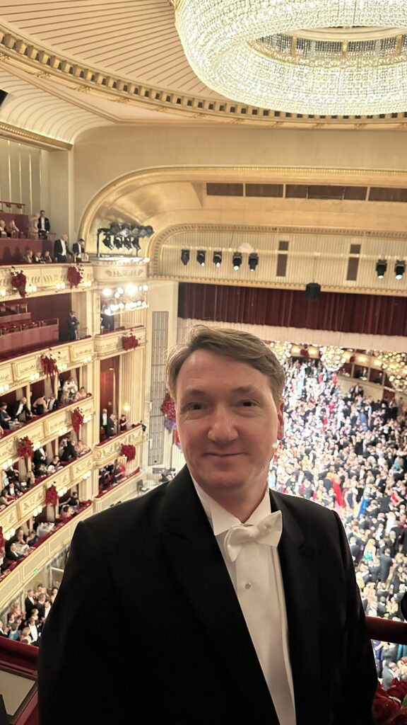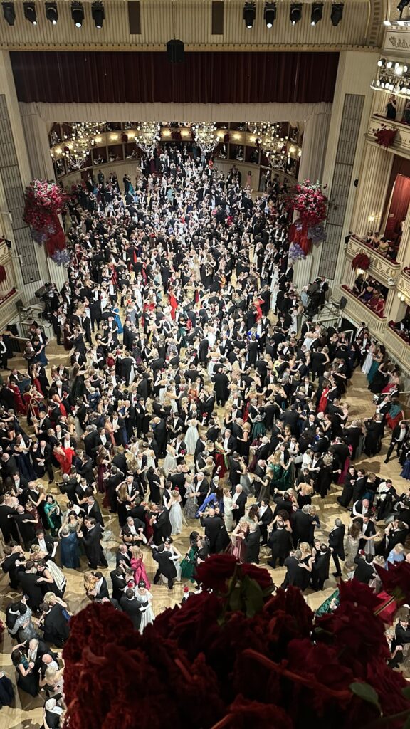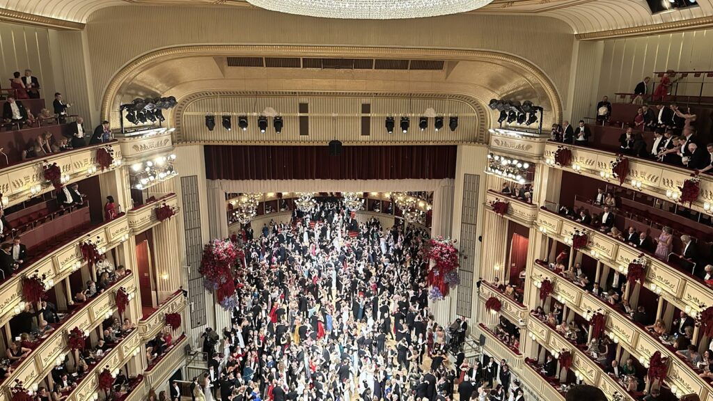 Um Punkt 22 Uhr begann die Eröffnung. Von unserem Platz auf der Galerie hatten wir perfekte Sicht auf das Parkett. Opernstars, Ballett, und dann die Debütantinnen und Debütanten – alles perfekt choreografiert, konzentriert, klassisch. Dieser Moment war für mich das eigentliche Herzstück des Abends. Gut zu wissen: Ohne Sitzplatz sieht man die Eröffnungszeremonie nur über Bildschirme in den Gängen der Oper. Das wäre dann wohl der teuerste Fernsehabend meines Lebens gewesen, wobei das Sofa zu Hause deutlich bequemer ist.