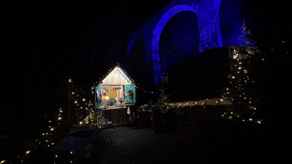 Die Kombination aus der aussergewöhnlichen Kulisse, dem beleuchteten Viadukt und den leuchtenden Hüttchen wirkt fast wie aus einem Märchen. Dazu die Geräusche des Bachs, der Duft von Tannenzweigen und Glühwein – es ist ein Weihnachtsmarkt, der weniger über Grösse, sondern über Atmosphäre funktioniert.