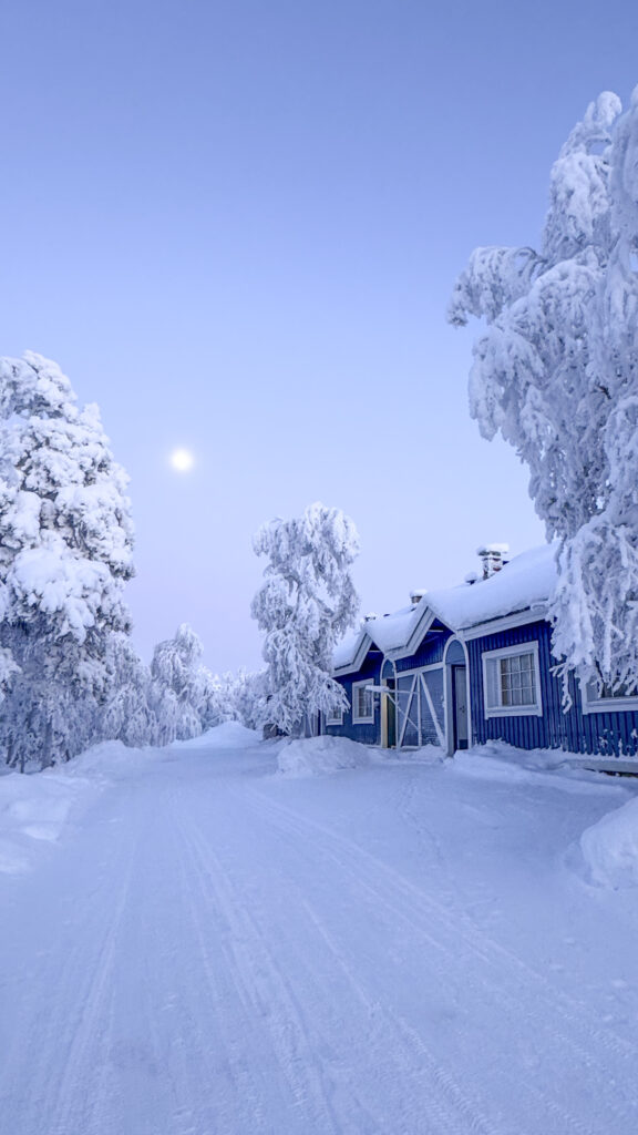 Die Landschaft wird dort noch offener, die Orte kleiner und die Natur wirkt noch ursprünglicher. Statt dichter Wälder wie rund um Ruka sieht man im Norden oft weite Schneelandschaften, gefrorene Seen und diese endlosen Horizonte. Dazwischen: Kleine Dörfer mit holzigen Blockhäusern und farbigen Häuschen in Rot und Blau und mittendrin die längste Schlittelpiste Finnlands. Im Norden merkst du plötzlich, wie gross Lappland wirklich ist. Und genau dieses Gefühl scheint viele Reisende dorthin zu ziehen.